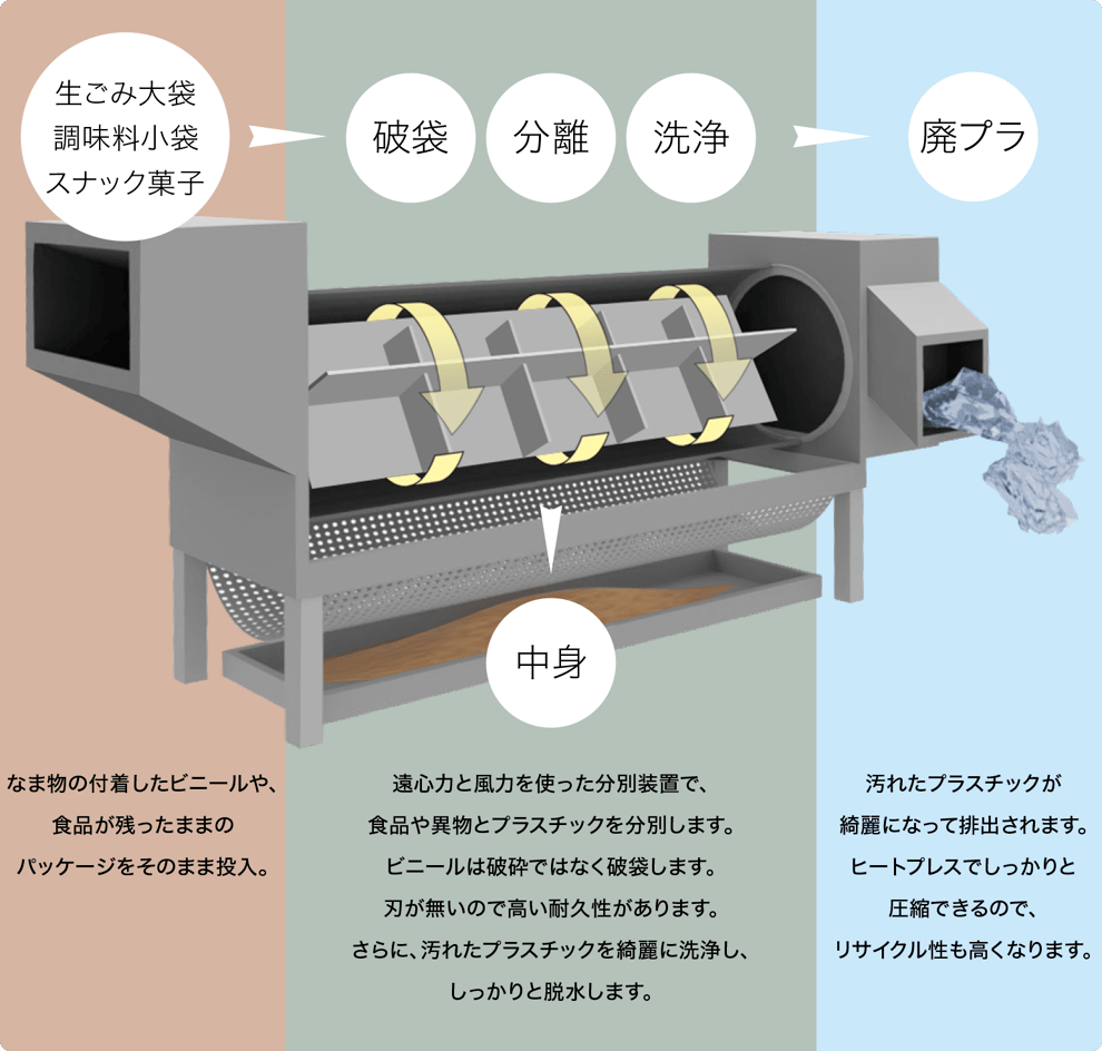 「破袋」「分離」「洗浄」します。